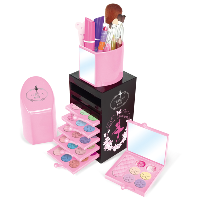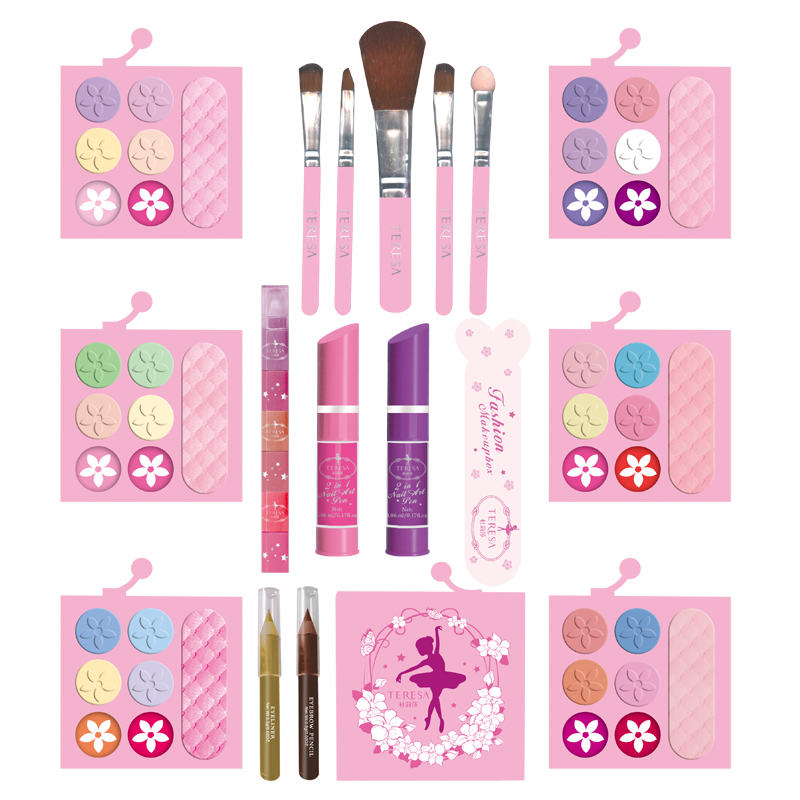 12色眼影,3色腮红,12色唇彩,6色唇膏,3色粉饼,12色湿眼影,1支眼线笔,1支眉笔,2只指彩,5只化妆刷,1化妆盒
