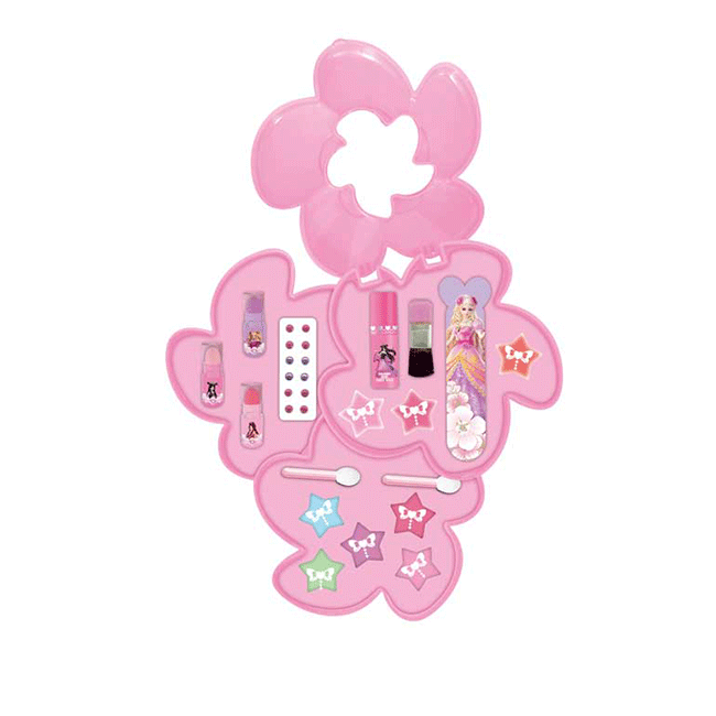3色眼影膏,2色腮红膏,3色唇膏,3色唇彩,1瓶指甲油,3条化妆刷,1张宝石贴,1个指甲锉