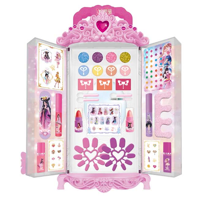4色眼影膏,4色闪粉唇彩,2瓶指甲油,2色腮红膏,1个分指器,2个指甲圈,4条化妆刷,2色唇彩,1个指甲锉,2张双面贴